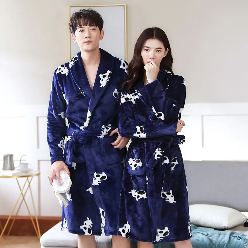 法兰绒家居服睡衣女秋冬加厚加绒保暖冬珊瑚绒睡袍男中长浴袍情侣
