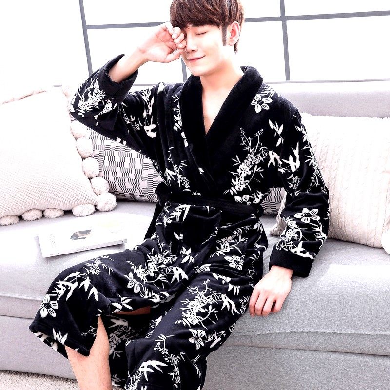 法兰绒睡袍男士冬季加绒保暖睡衣珊瑚绒浴袍中长中厚款浴衣家居服
