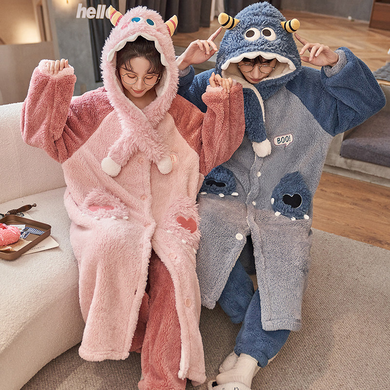 连帽卡通情侣款法兰绒睡袍男款秋冬季浴袍加厚加绒女家居宽松睡裙