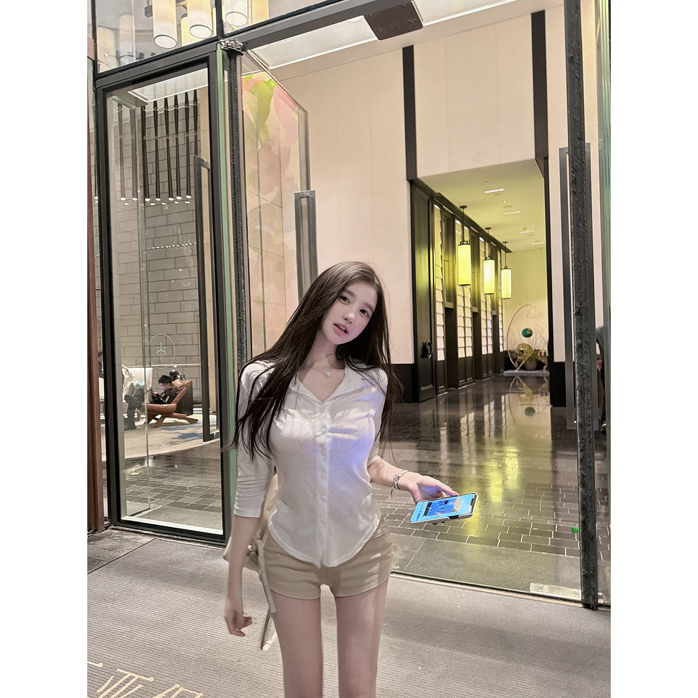 若语定制 白女松弛 70雪花棉微透中袖衬衫纯欲气质性感上衣女衬衣