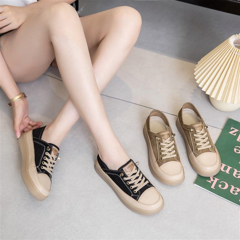 头层牛皮浅口复古女单鞋2025秋季新款百搭平底鞋一脚蹬镂空小白鞋