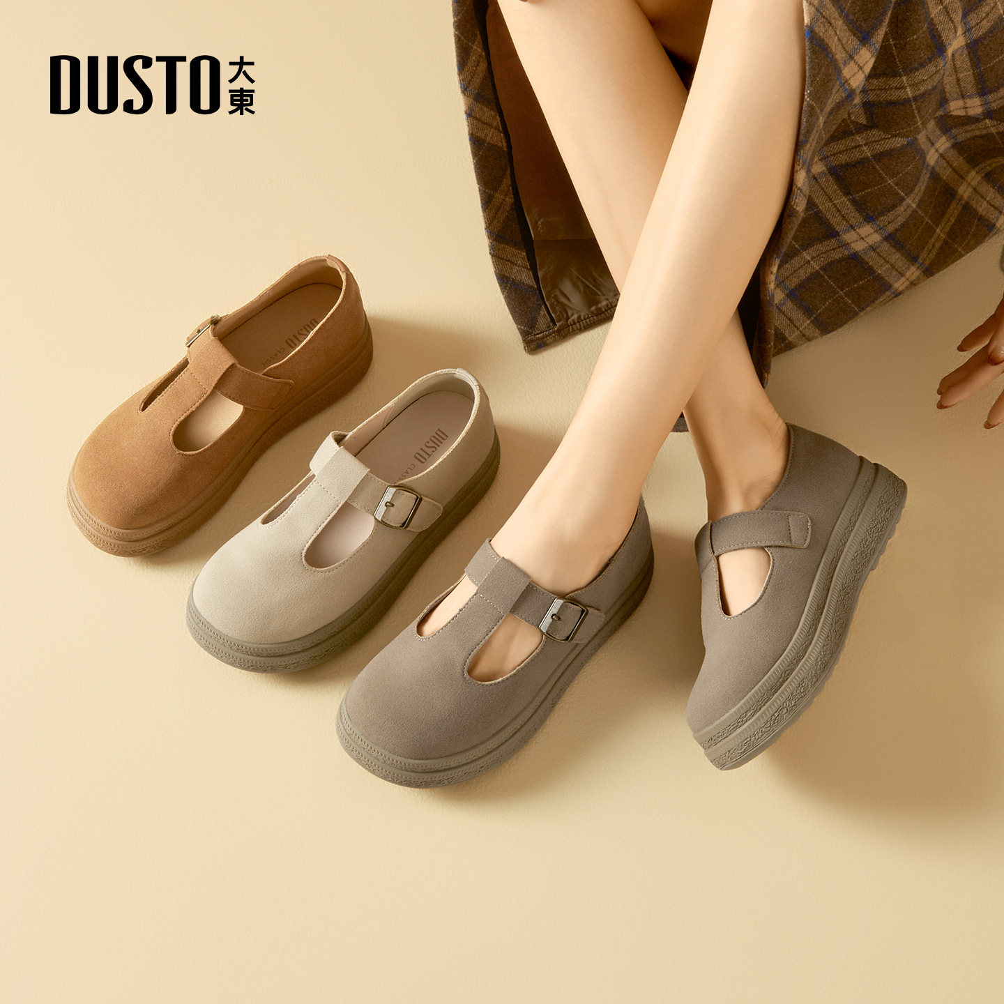 大东女鞋勃肯鞋2026春季新款厚底复古女单鞋圆头魔术贴增高豆豆鞋