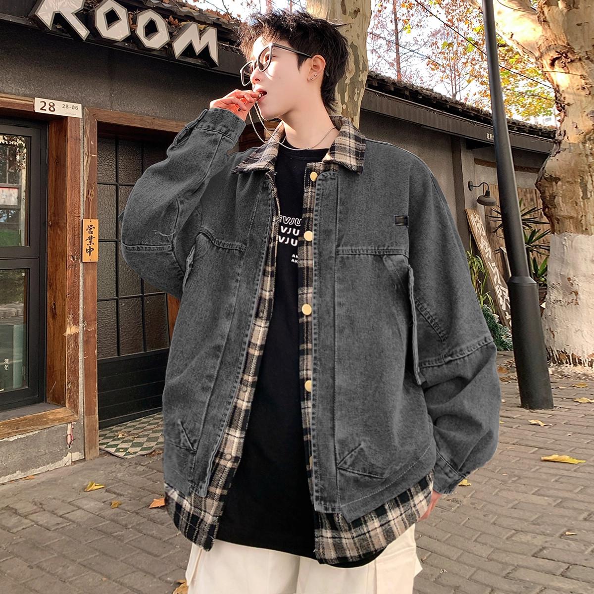 大码日系复古翻领假两件格子牛仔夹克男秋季美式潮牌痞帅宽松外套