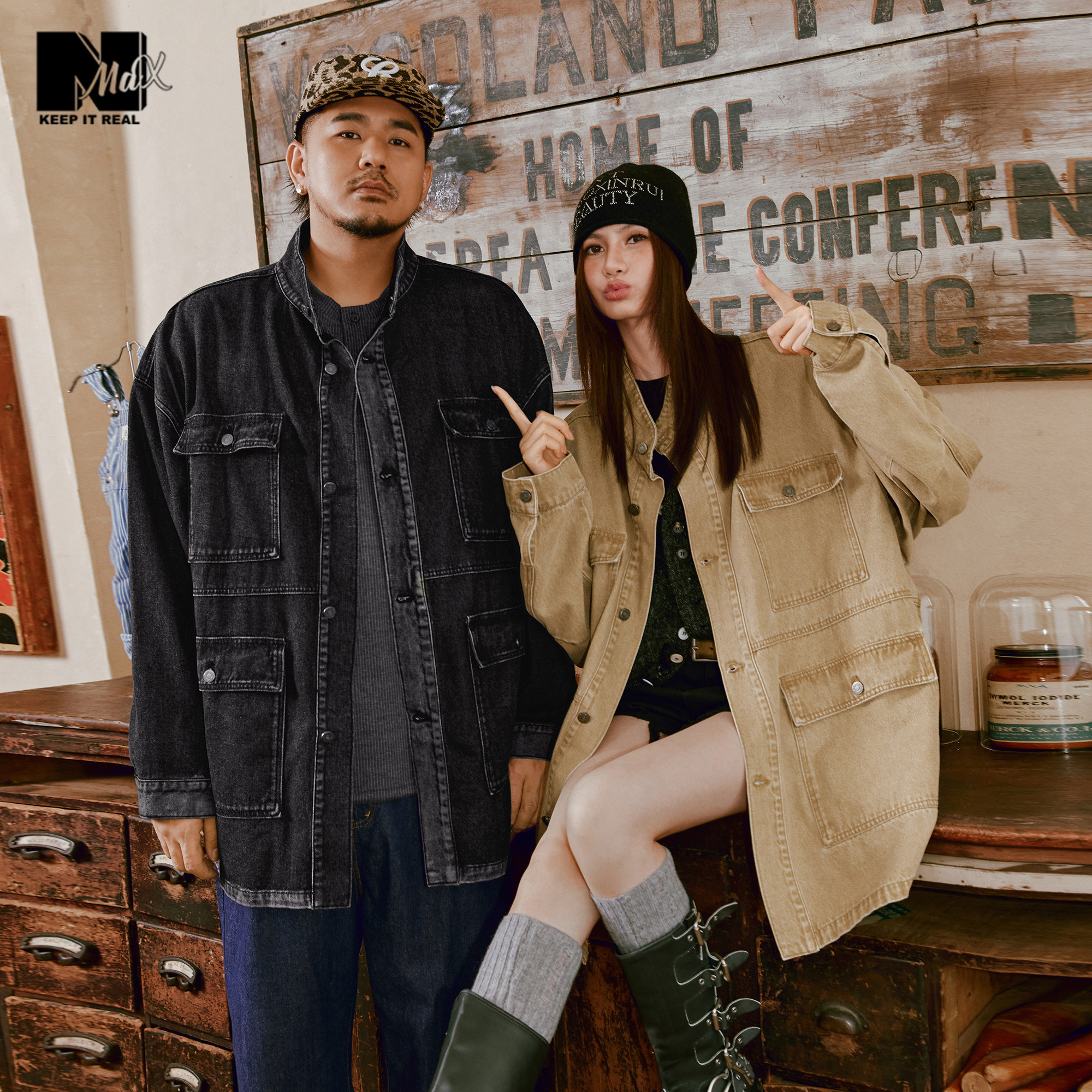 NMAX大码潮牌男装新品复古风美式工装立领多口袋洗水牛仔夹克外套