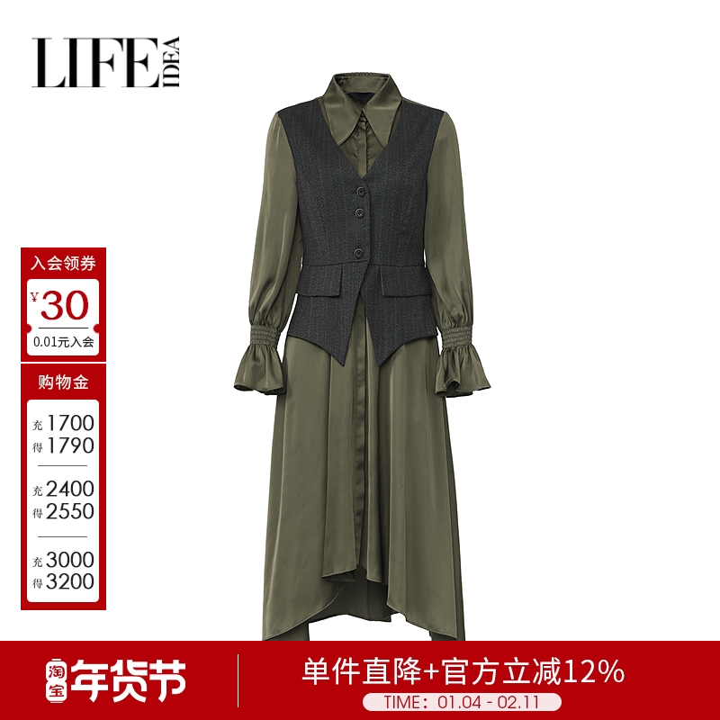 莱芙艾迪儿女装设计感新款衬衫长裙女复古宫廷袖不规则下摆连衣裙