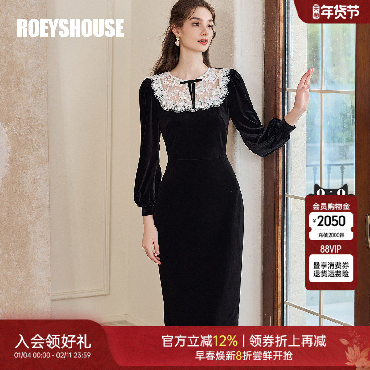 罗衣复古宫廷风丝绒连衣裙2025冬季新款优雅拼接蕾丝中长裙10933