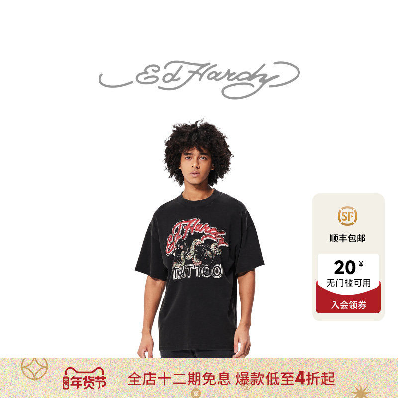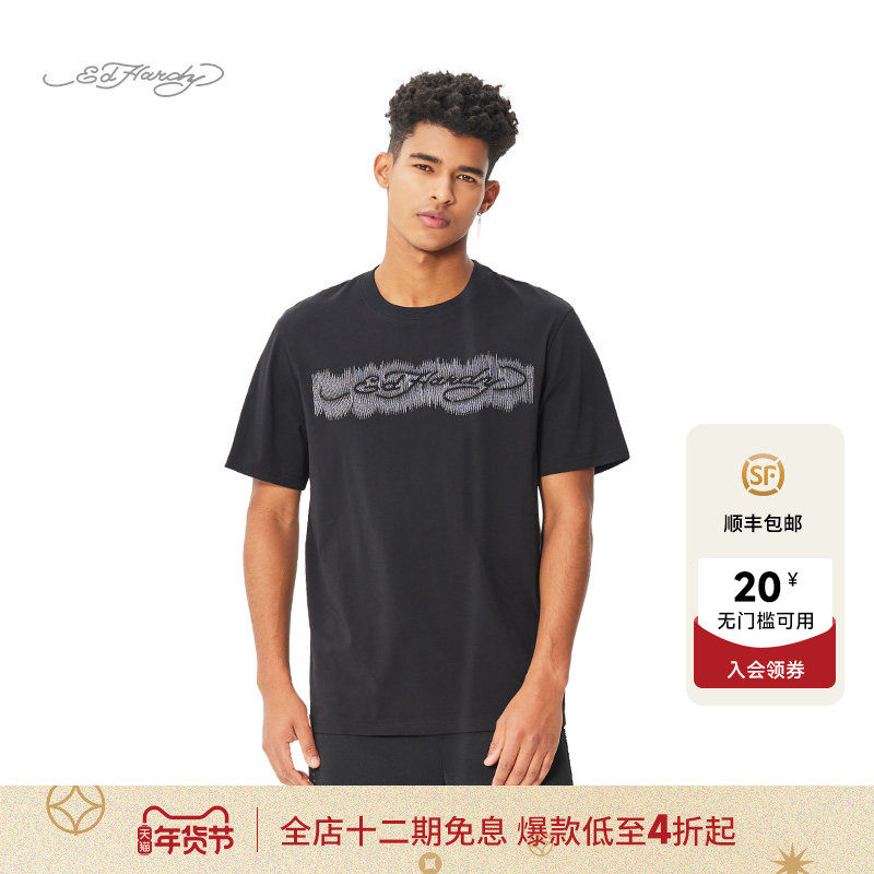 Ed Hardy埃德哈迪2025春季黑色白色新款烫钻绣花男士短袖T恤