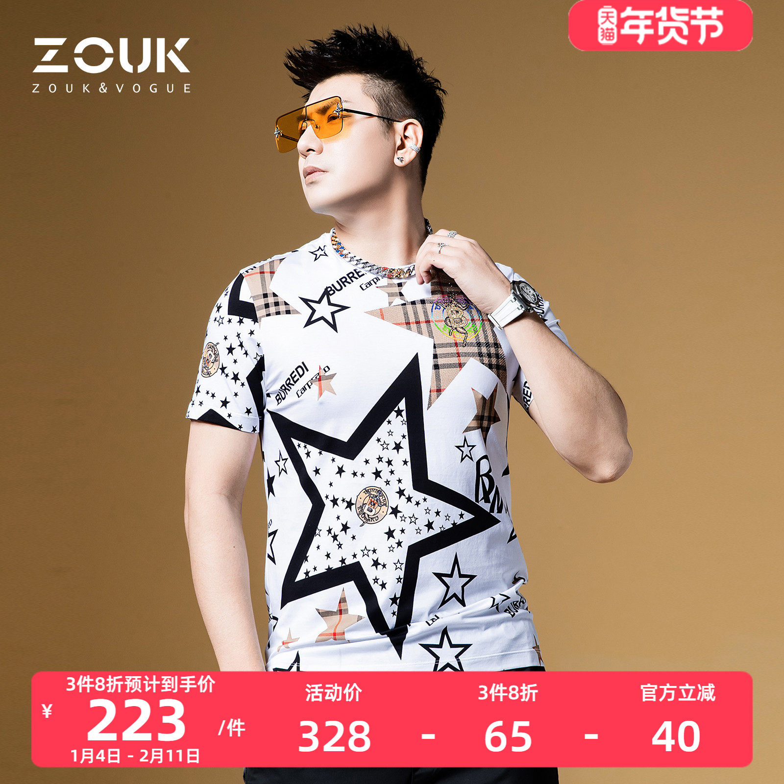 ZOUK欧洲站男装高级感印花星星t恤男烫钻短袖潮牌潮流体恤夏季