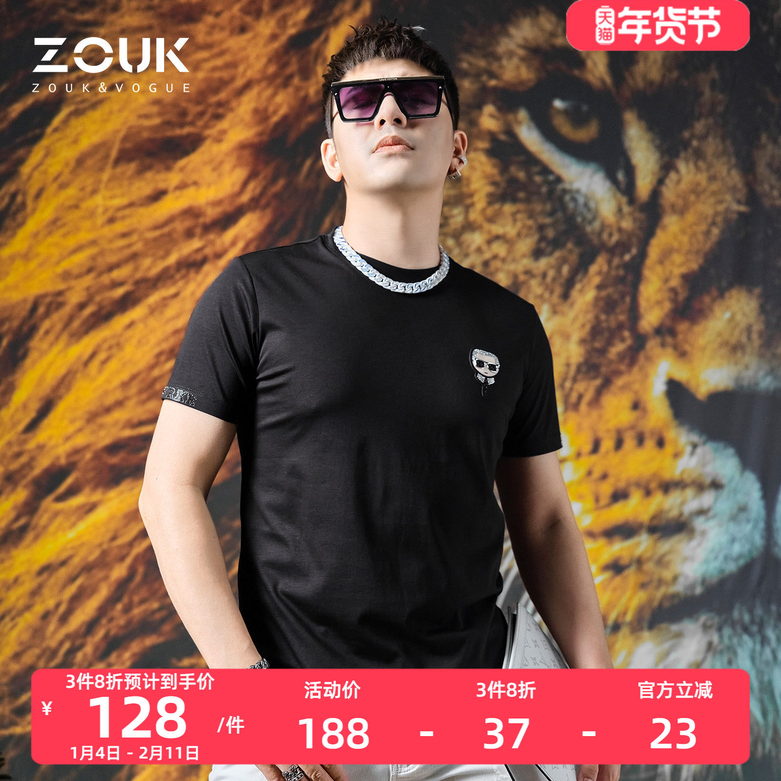 GHILARO/古劳吉那诺男士百搭烫钻胶印动物印花休闲短袖T恤7005-70