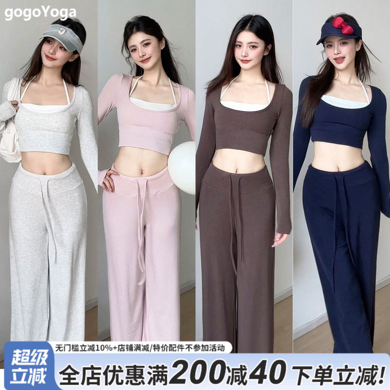 休闲运动套装女秋冬带胸垫假两件长袖瑜伽服显瘦修身阔腿裤健身服