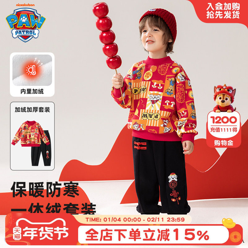 汪汪队男童新年服加绒卫衣套装秋冬2026新款冬装男孩加厚儿童衣服