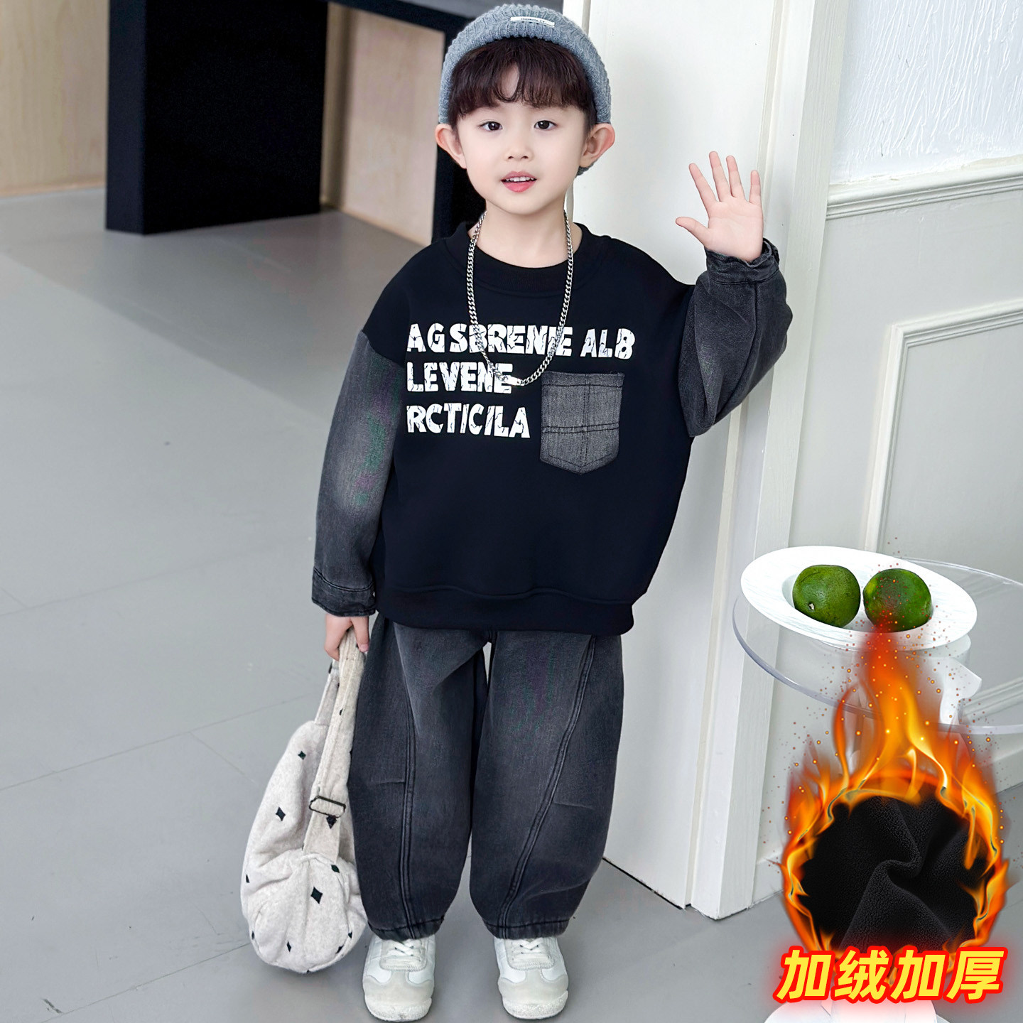 男童加绒卫衣套装2025冬季新款帅气男孩男宝宝冬装加厚两件套时髦