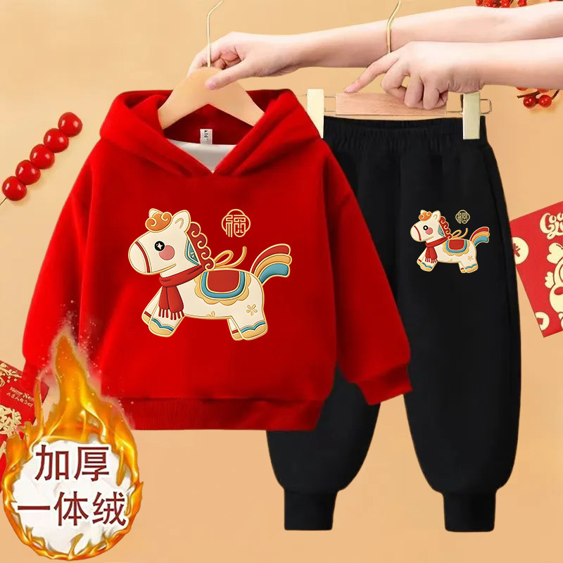 男童女童2026马年红色喜庆卫衣卫裤两件套儿童加绒加厚一体绒套装