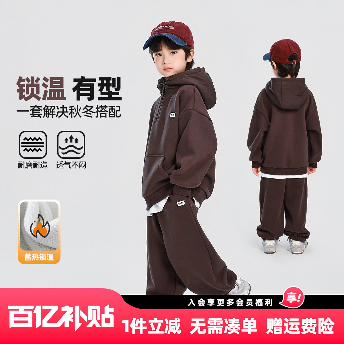 [抗菌锁温]男童卫衣裤子两件套儿童红色加绒裤冬装宝宝套装冬加厚