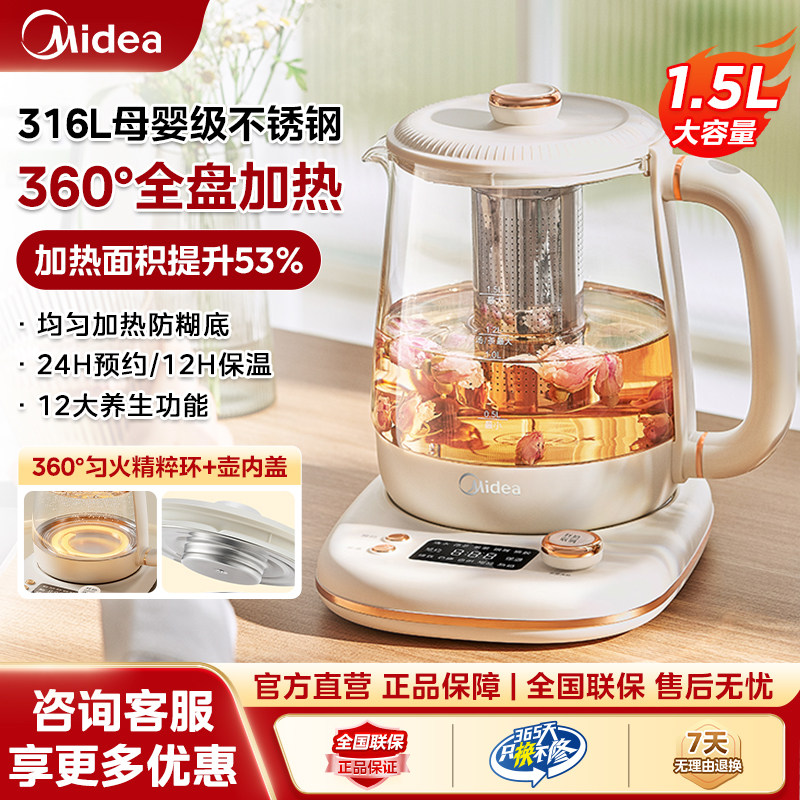 美的全玻璃恒温养生壶家用多功能办公室小型煮茶壶电热水壶纯玻璃
