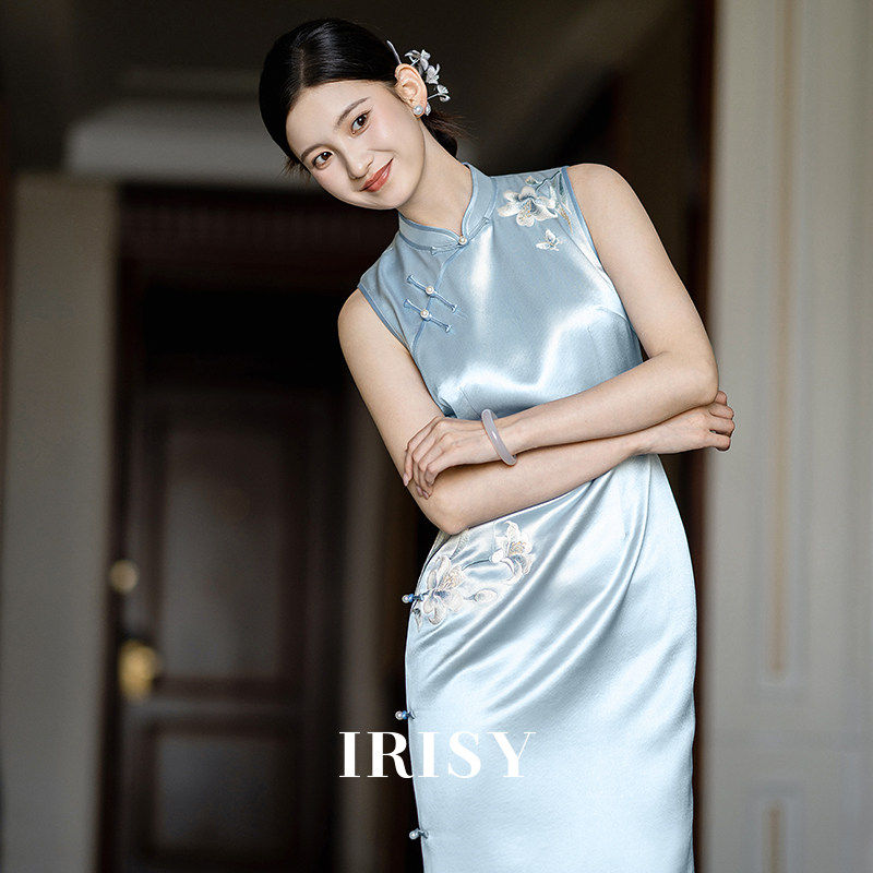 IRISY「兰鸢」新中式蓝色改良刺绣旗袍夏季气质新娘订婚敬酒礼服