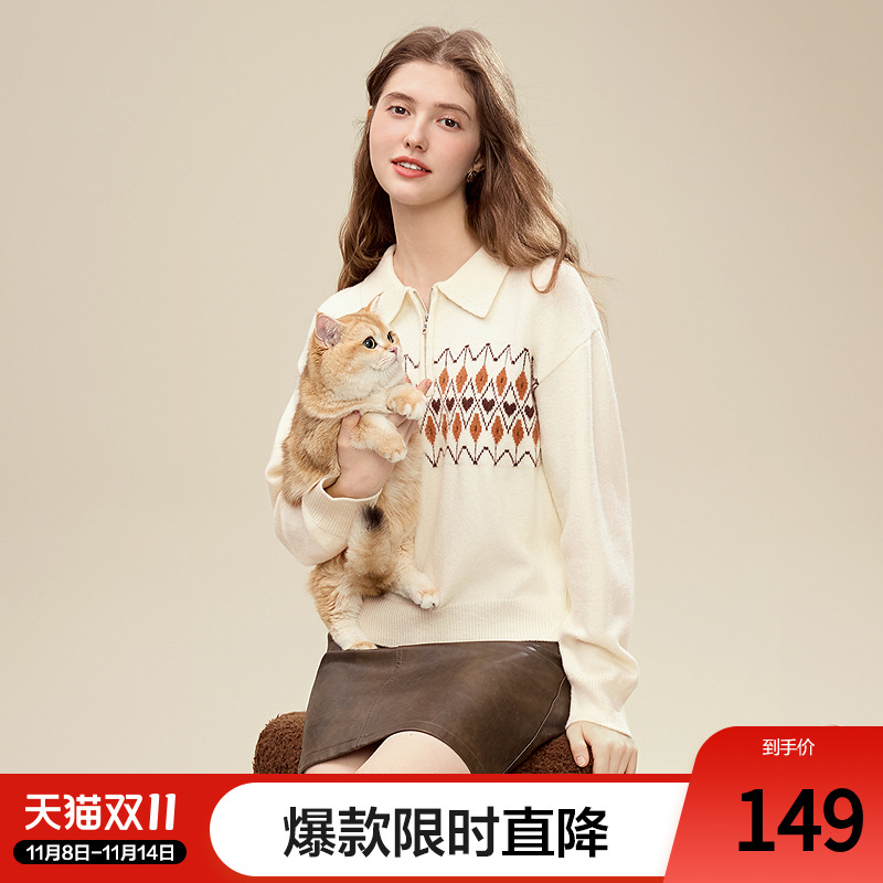 betu百图慵懒风费尔岛半拉链毛衣女2025年冬季新款复古长袖针织衫