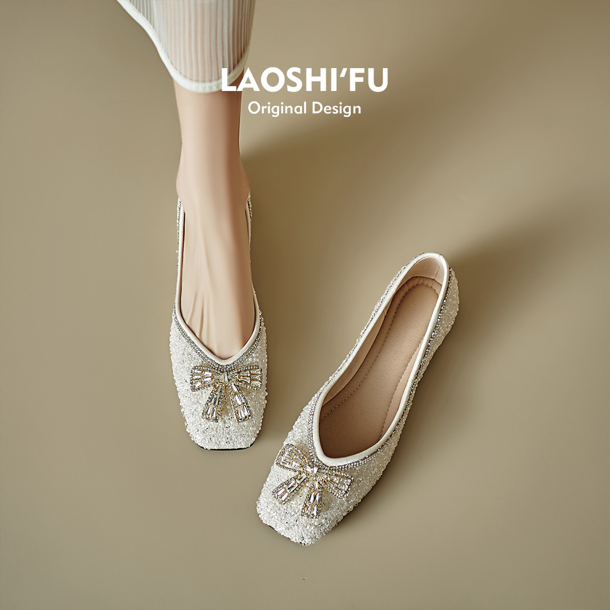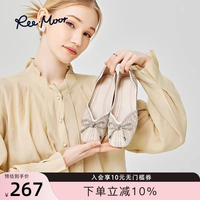 REEMOOR睿慕水钻单鞋女2026春新款浅口珍珠蝴蝶结船鞋平底鞋婚鞋