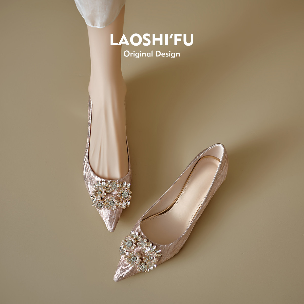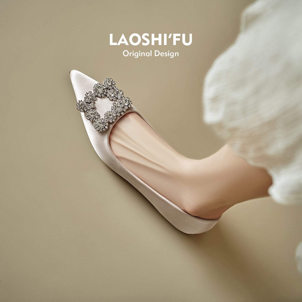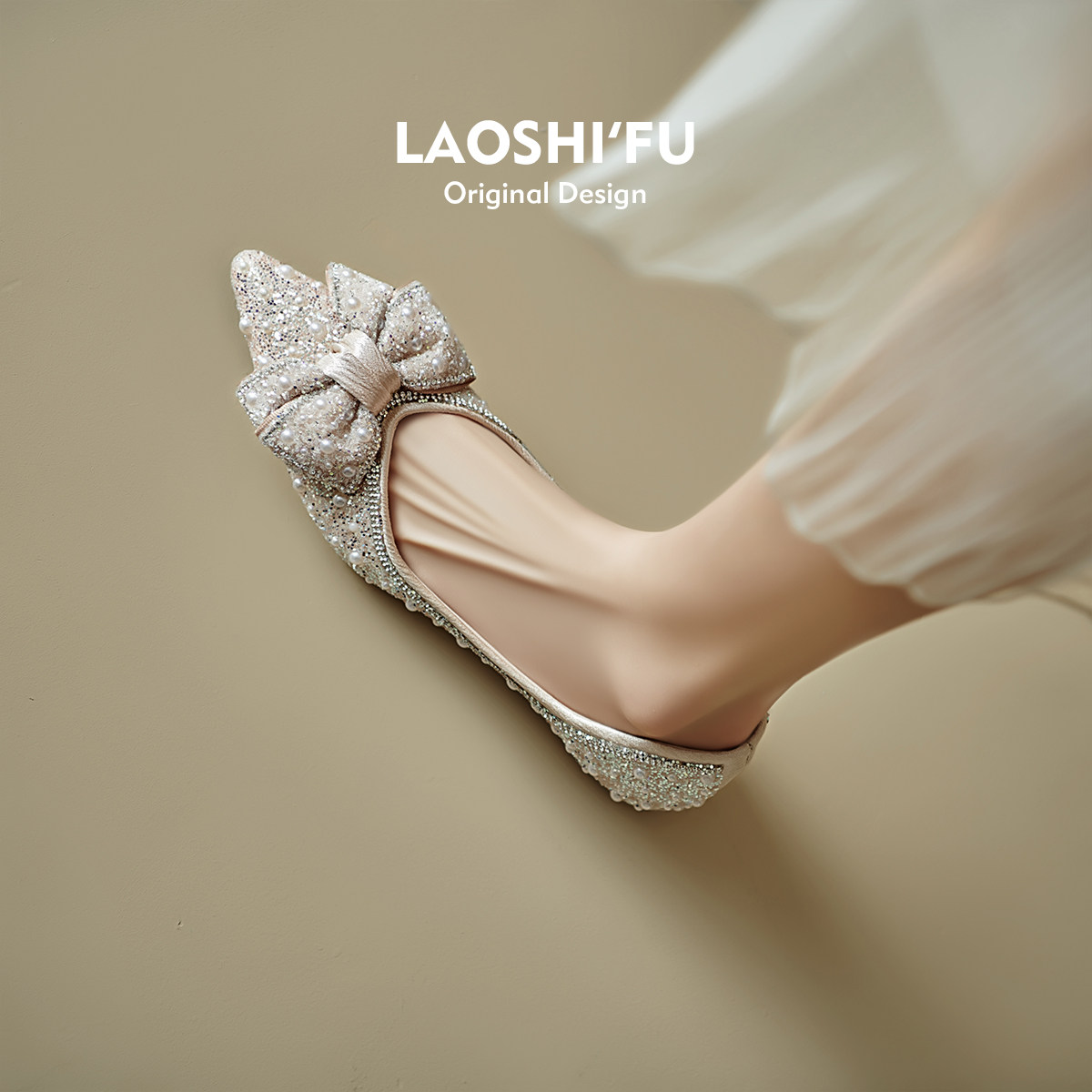 羊皮版!法式水钻平底单鞋女2025春季新款气质尖头低跟新娘鞋婚鞋