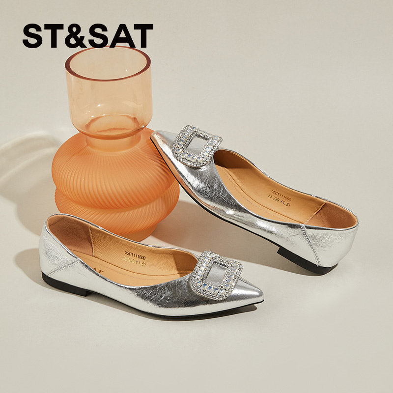 星期六女浅口单鞋春季新款银色百搭气质婚鞋名媛尖头平底软底女鞋