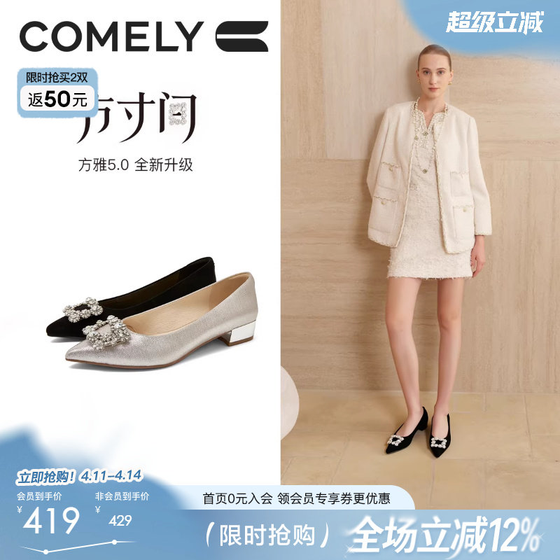 康莉真皮水钻浅口单鞋春季季商场新款尖头方扣低跟女鞋平底鞋婚鞋