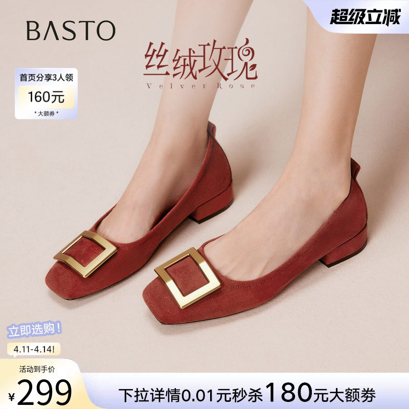 【丝绒玫瑰】百思图26春新款方扣红色单鞋高跟粗跟浅口女平底婚鞋