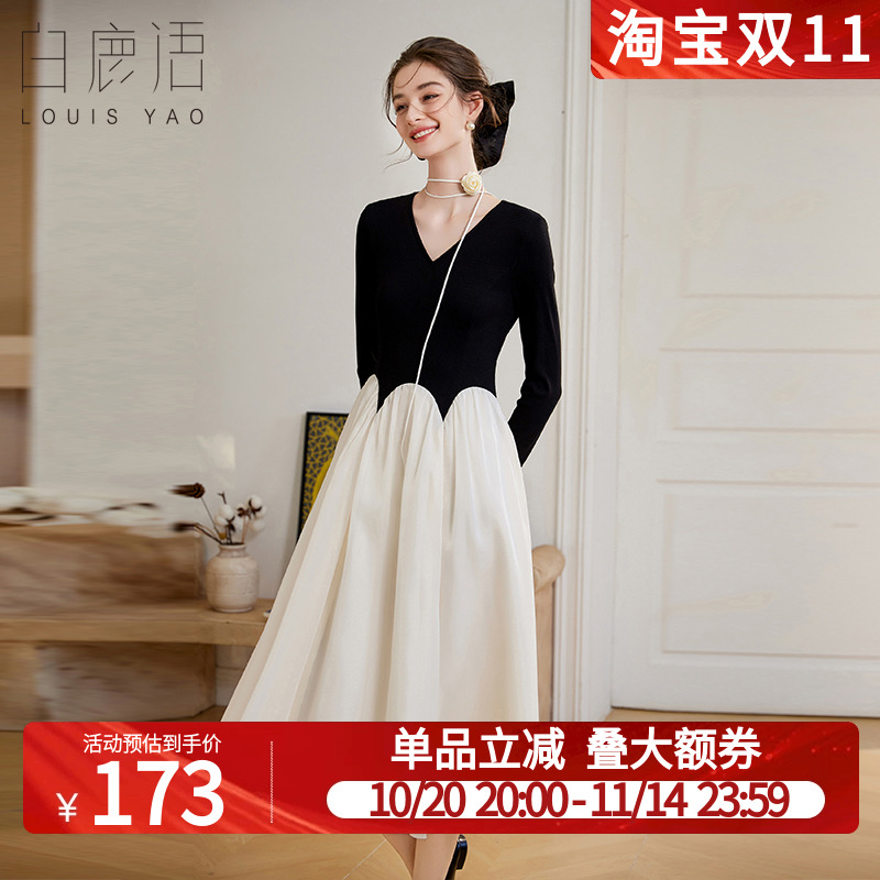 白鹿语优雅V领撞色拼接长裙2025春季新款设计感层次大裙摆连衣裙