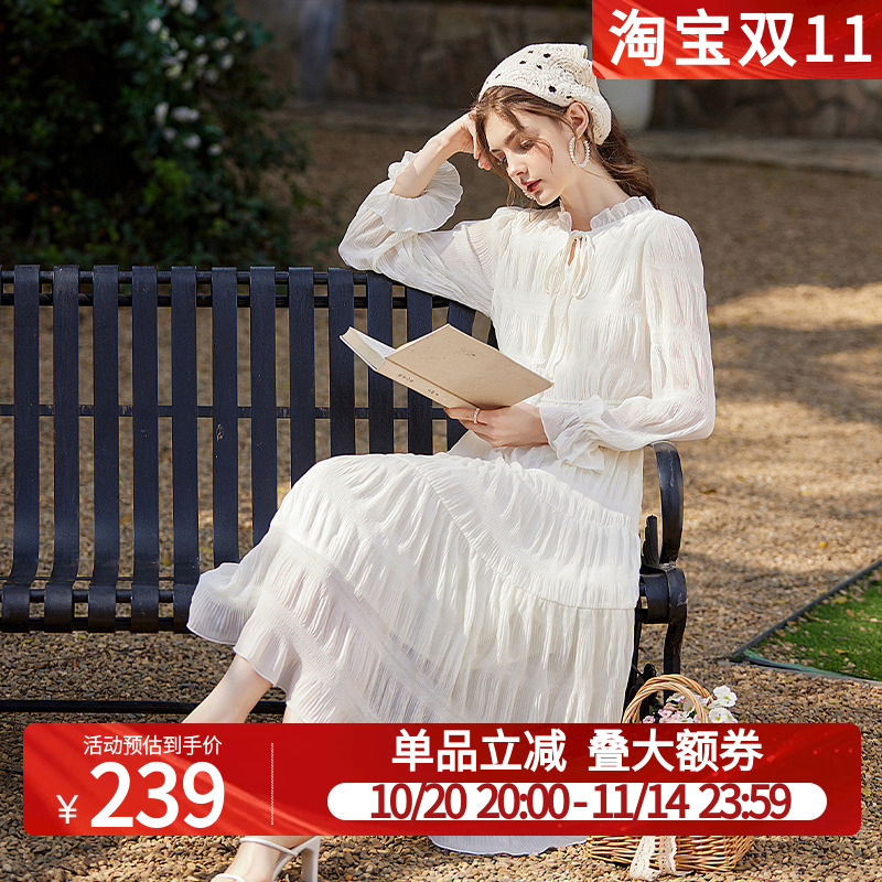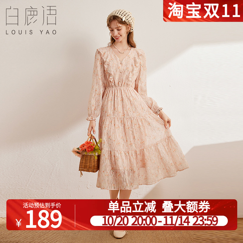 白鹿语法式优雅连衣裙女2025春季新款V字系带领气质显瘦仙女裙