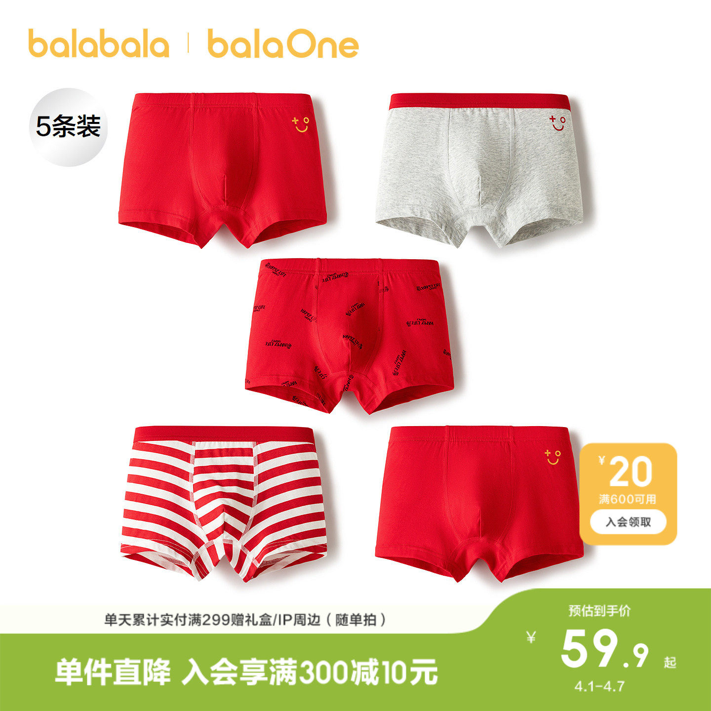 巴拉巴拉儿童内裤平角棉男童短裤女童四角裤本命年红色新年五条装