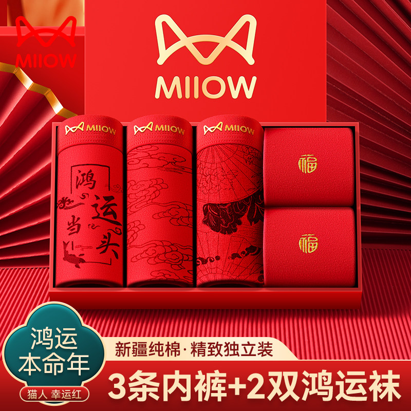 MiiOW/猫人酒红色男士内裤莫代尔透气平角四角底裤结婚本命年短裤