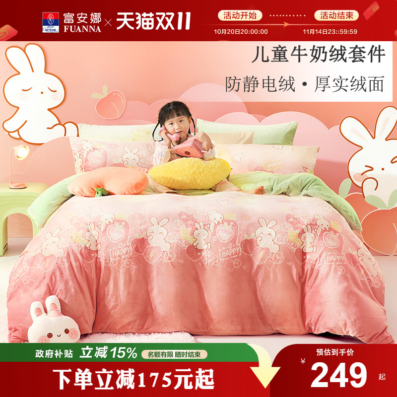 富安娜家纺牛奶绒四件套加厚保暖儿童床单被套三件套秋冬床上用品