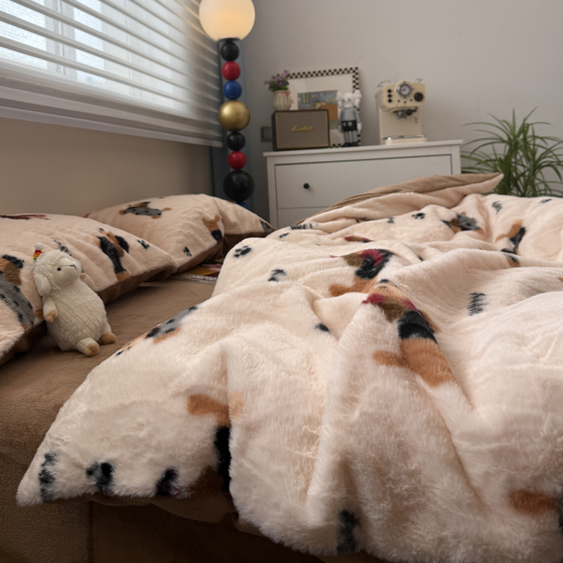 冬季保暖卡通音乐腊肠狗兔绒牛奶绒四件套加厚床单被套珊瑚绒床品