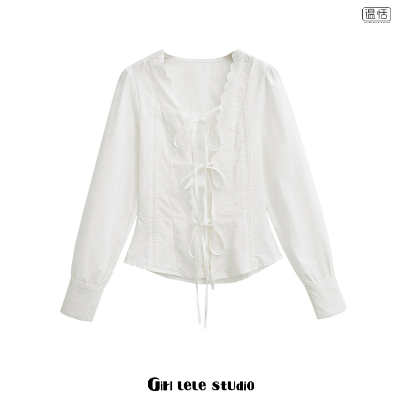 【包邮】法式复古蕾丝拼接白色V领系带蝴蝶结长袖衬衫女收腰上衣