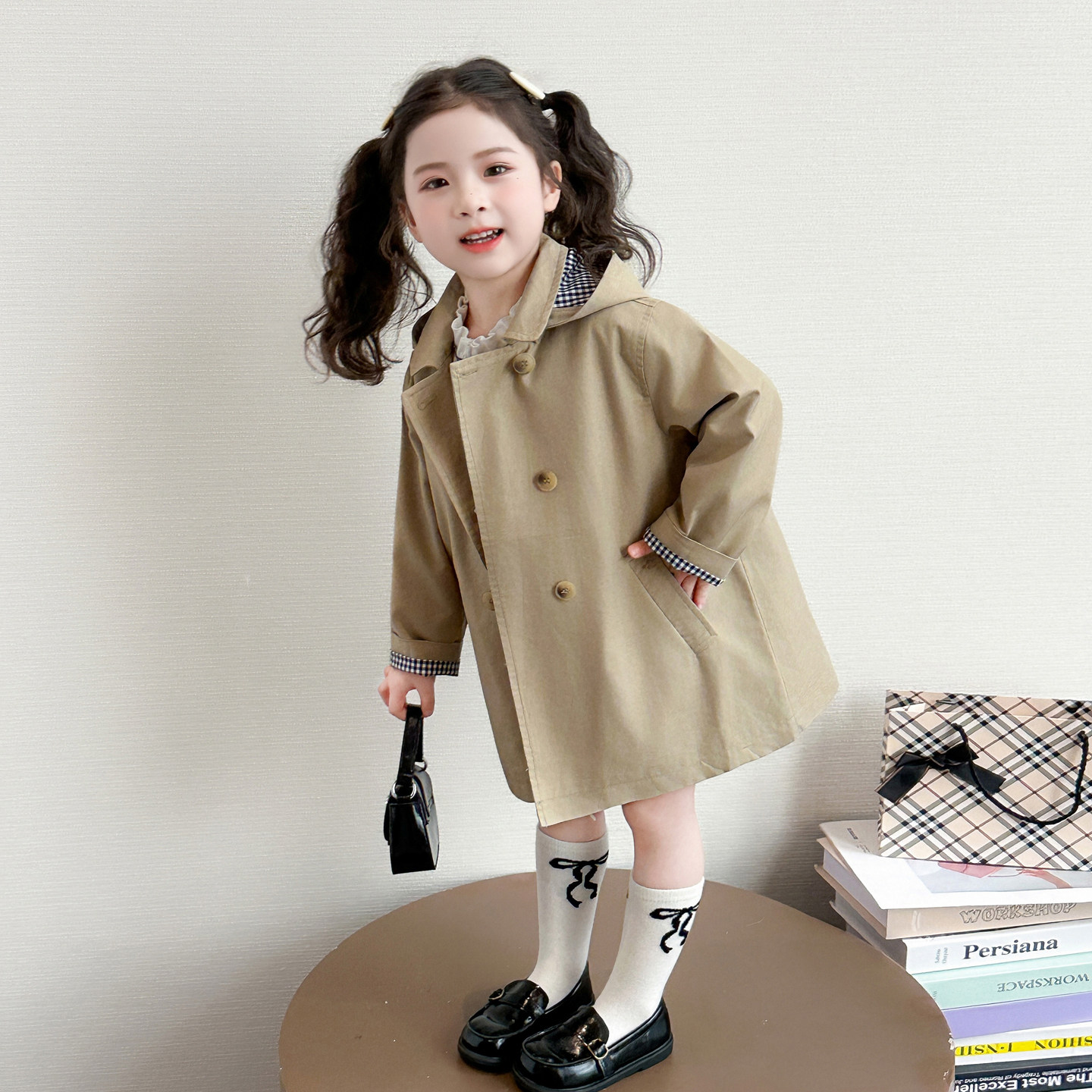 小童中长款外套潮2026女宝宝拼格子韩版风衣女童春装大衣连帽休闲