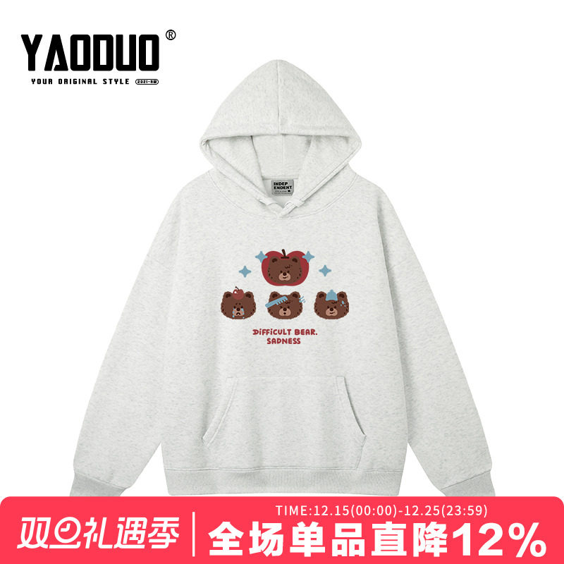 日系原宿风小熊可爱印花连帽卫衣女oversize新款大码花灰色外套潮