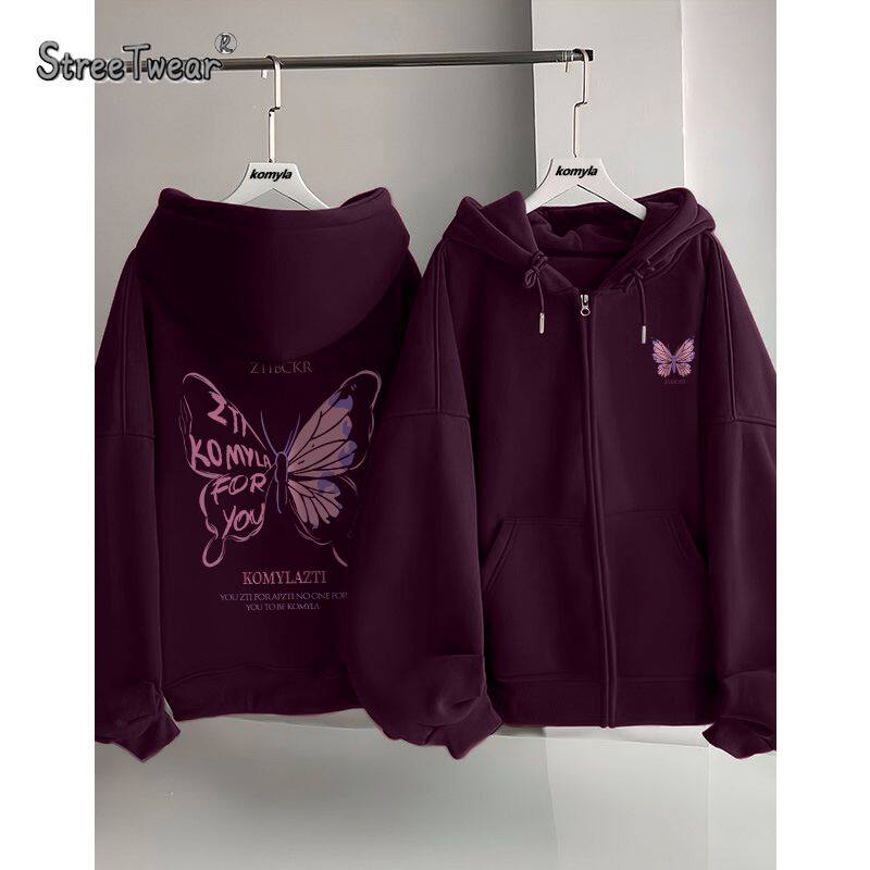 秋冬新款巨好看葡萄紫拉链开衫连帽卫衣古着原宿风蝴蝶印花外套女