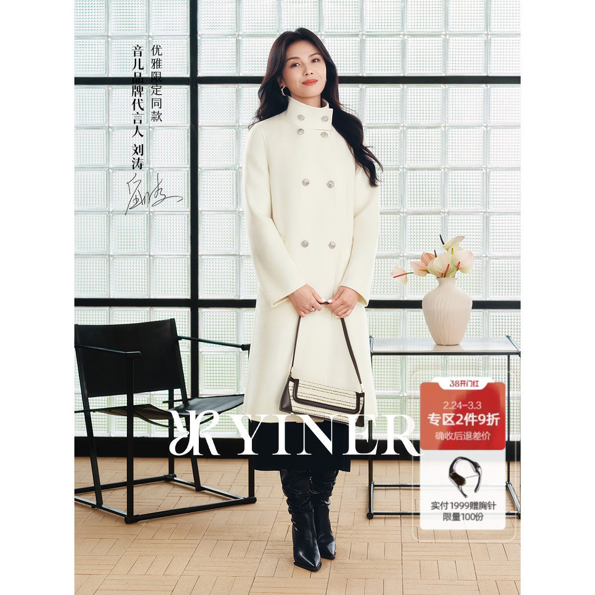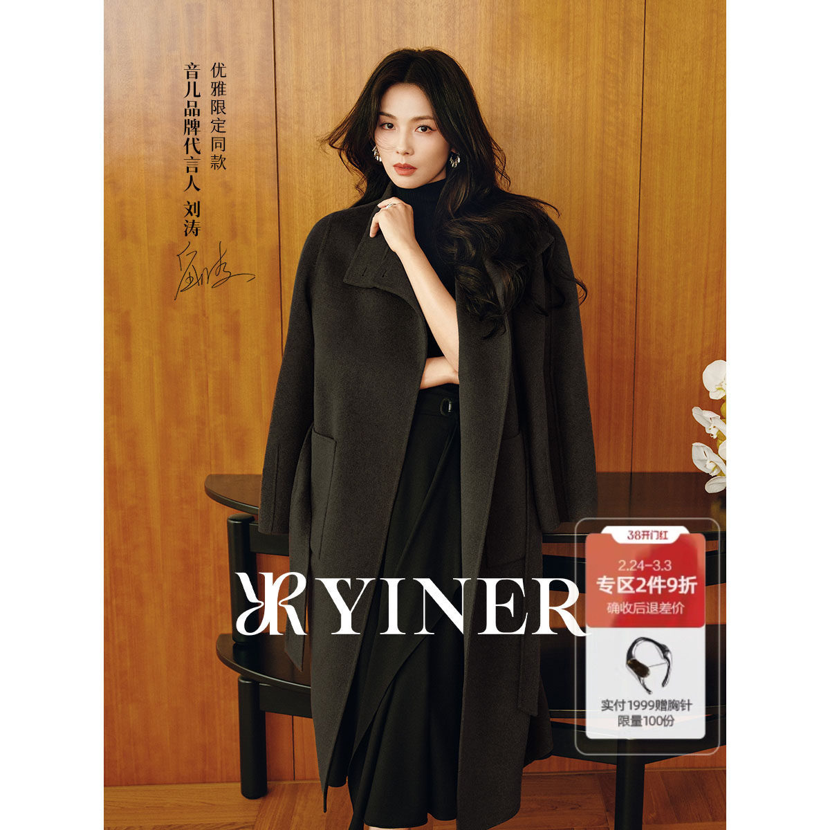 【刘涛同款】YINER音儿2025冬季新款纯羊毛两穿领型双面呢大衣