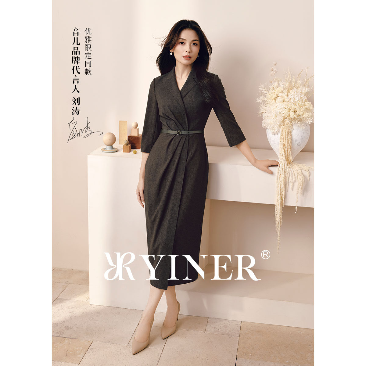 【刘涛同款】YINER音儿2026春季新款优雅美丽诺羊毛混纺连衣裙