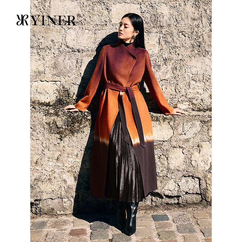 【刘涛同款】YINER音儿2025冬季渐变中式立领长款羊毛双面呢大衣