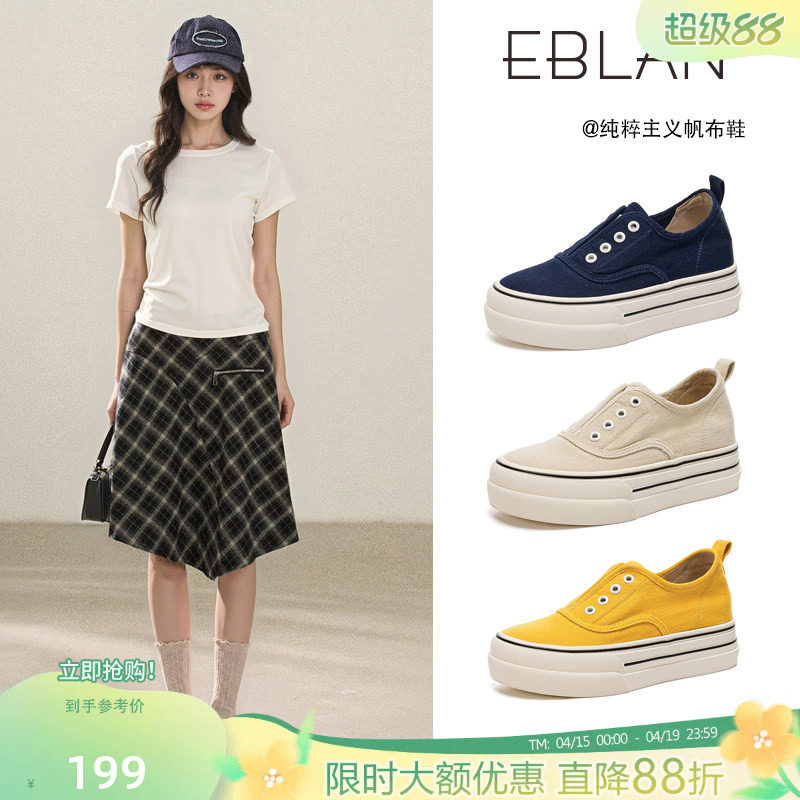 EBLAN/伊伴厚底内增高帆布鞋女2026春季新款一脚蹬乐福鞋懒人板鞋