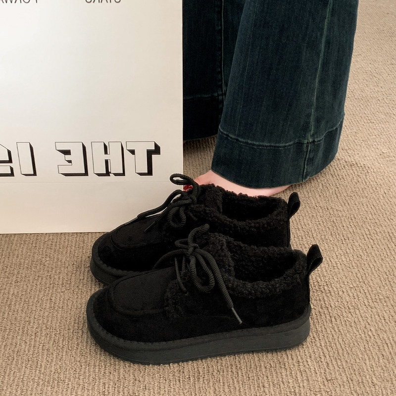 毛球系带羊羔毛毛平底棉鞋女冬2025新款复古咖色圆头浅口加绒单鞋