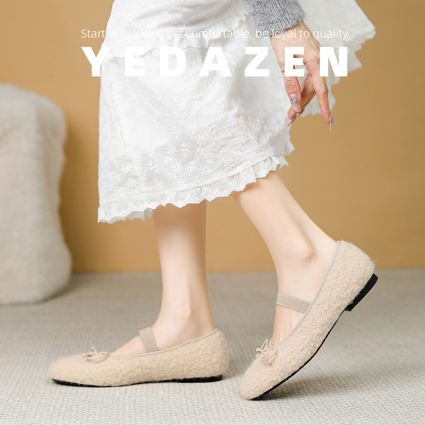 杏色浅口平底加绒芭蕾舞棉鞋女外穿2025秋冬新款法式圆头毛毛单鞋