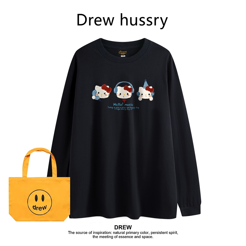 Drew美式潮牌HelloKitty可爱休闲印花圆领纯棉长袖T恤春秋情侣装