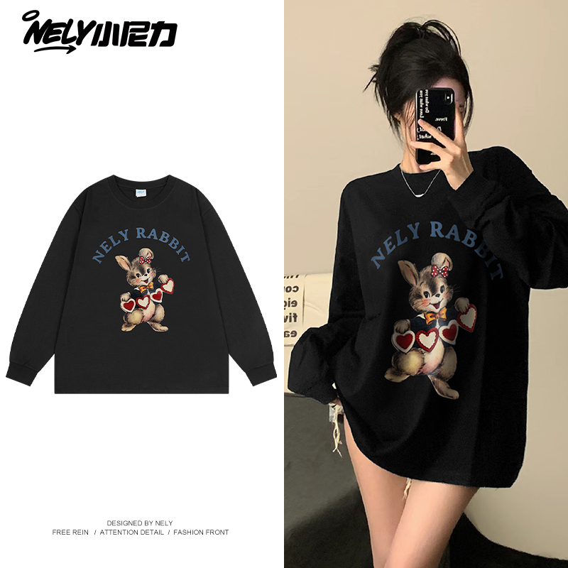 小尼力ins国潮美式兔子涂鸦印花长袖T恤男女春秋情侣装休闲打底衫