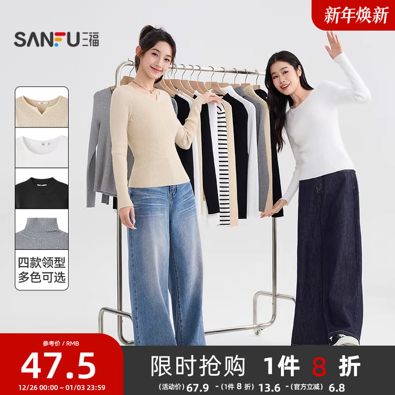 三福长袖上衣2025新款秋季圆领修身针织衫简约纯色内搭打底衫女装