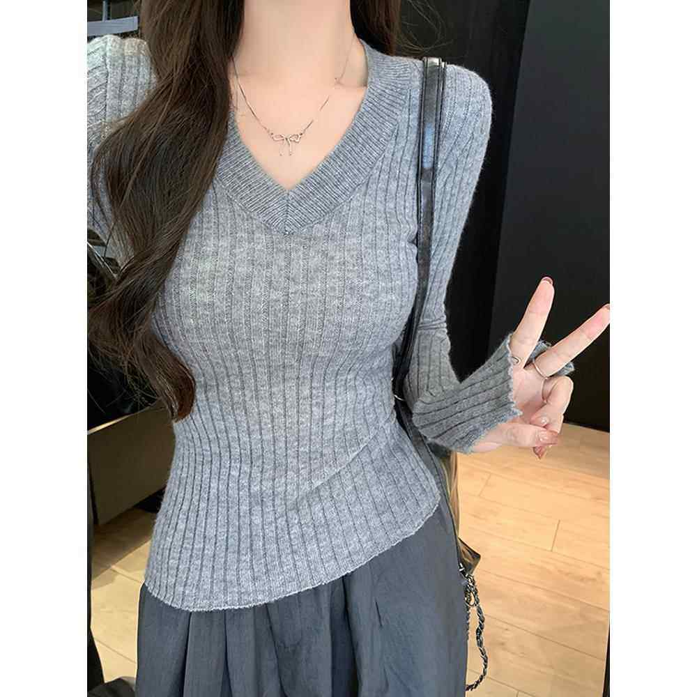 灰色2025新款早秋v领套头长袖打底针织衫女修身紧韩系内搭上衣白