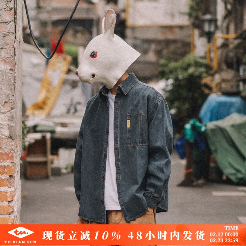 兔先森春秋季美式复古潮流工装牛仔衬衫男装长袖休闲衬衣男士外套