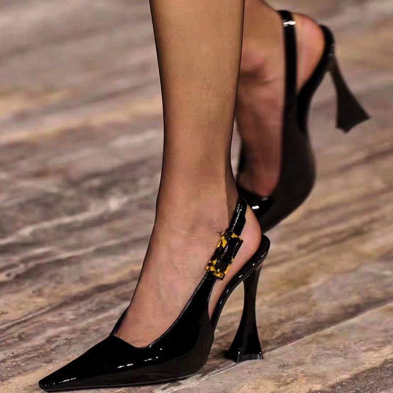 杨树林同款高跟鞋性感气质百搭漆皮尖头马蹄跟一字带后空包头凉鞋