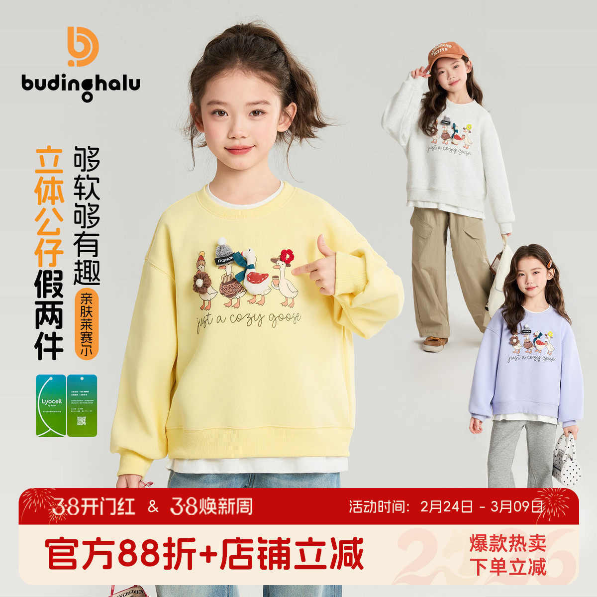布丁哈鲁春装女童童装休闲上衣2026春季新款儿童公仔假两件卫衣