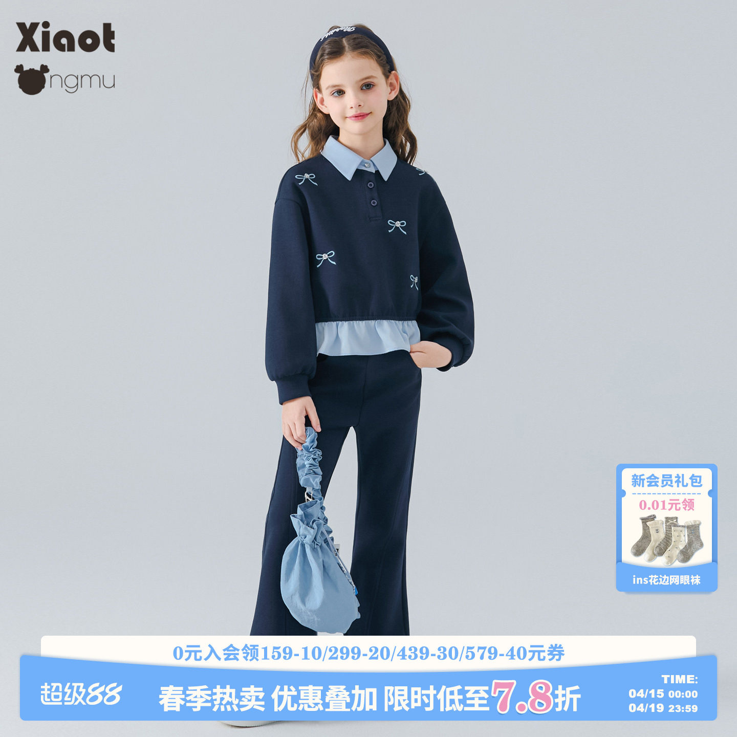 小童木 学院风女童运动套装春装新款女大童假两件刺绣卫衣喇叭裤